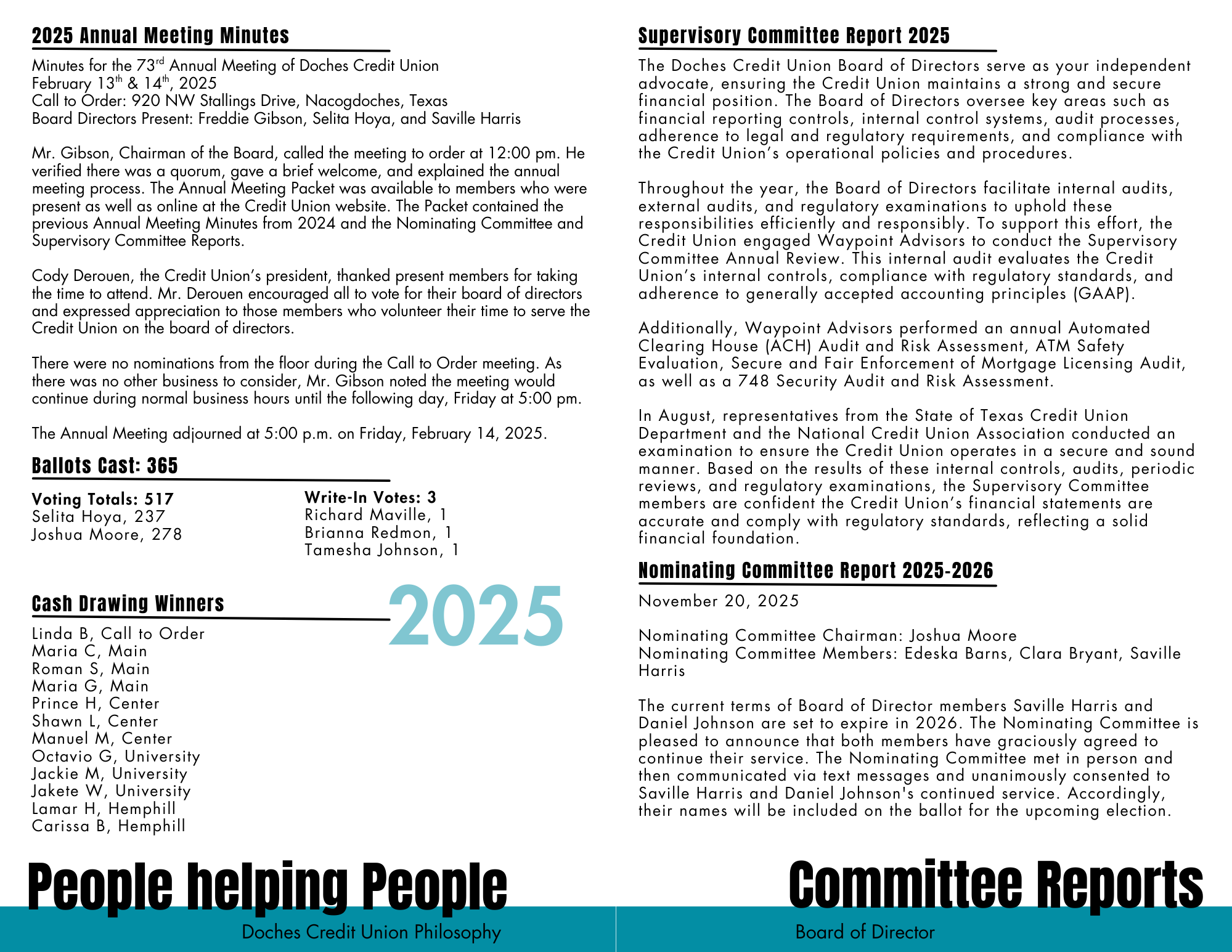 Each year Doches Credit Union members join together to discuss the highlights of the previous year, hear from Credit Union leaders, vote for the credit union's Board of Directors, and celebrate the cooperative spirit. Credit Unions are run by its members, and all members are eligible to run and volunteer on the board of directors.